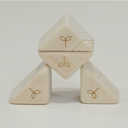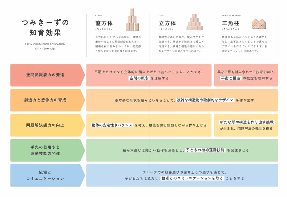 基本のつみきは立方体・直方体・三角柱の3パターンのみ。たった3つのカタチだからこそ、子どもの創造力を無限に引き出します。